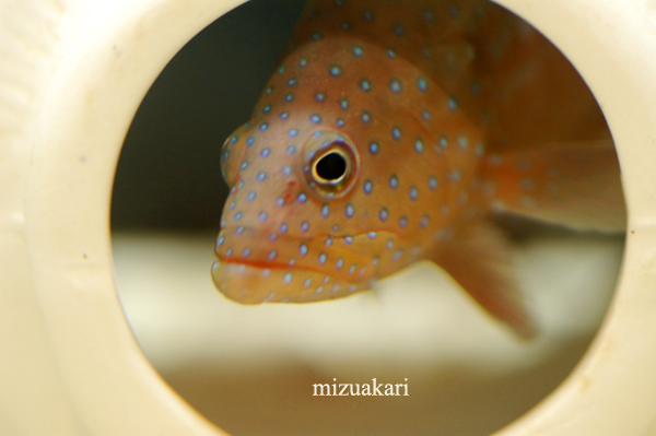 ユカタハタ学名:Chephalopholis miniatus分類:スズキ目ハタ科浴衣のような淡い色彩のユカタハタ。この柄だと女の子の浴衣みたいですが、ハタ科のなかまは、ほぼすべて雌雄同体なのです。Tag:100mmF2.8Macro
