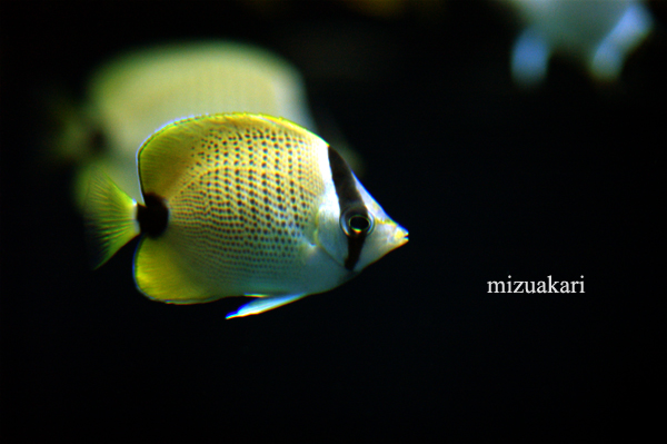 レモンバタフライフィッシュ学名:Chaetodon miliaris 分類:スズキ目チョウチョウウオ科ハワイ島の固有種で、体がレモンのような黄色に染まります。別名のミレットシード(きびの意)の通り、平べったいものが多いチョウチョウウオの中でも、ぷっくりしています。バックに写っているのは別の個体で、少数でも群れをつくり一緒に泳ぐようです。
